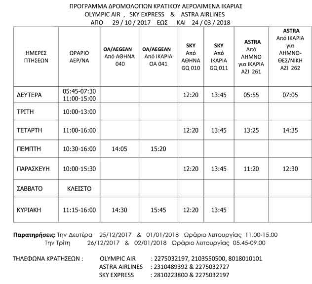 Παρουσιάζουμε τον αναλυτικό πίνακα με όλα τα χειμερινά δρομολόγια των αεροπλάνων από και προς την Ικαρία, για την περίοδο 29.10.2017 έως 24.03.2018, καθώς και το ωράριο λειτουργίας του αερολιμένα Ικαρίας για το διάστημα αυτό.